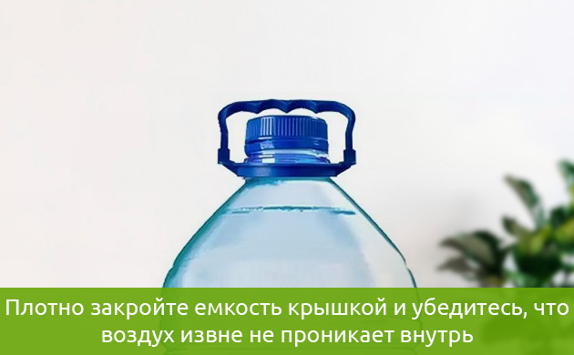 - Плотно закройте емкость крышкой и убедитесь, что воздух извне не проникает внутрь контейнера (бутыли).