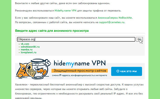 • Анонимайзер. Он позволяет скрывать метаданные (данные о данных) вашего компьютера и использует для доступа удаленные серверы. Просто введите в поиск браузера слово анонимайзер, перейдите по любой ссылке и введите адрес сайта Olkpeace.org. Готово, доступ открыт! Есть только одна проблема: такие сайты-анонимайзеры частенько блокируют. Но на их месте появляются новые, так что пара секунд поиска, и вы снова в деле. Также работа через анонимайзеры сопровождается обилием рекламы, но это небольшая плата за удобство.