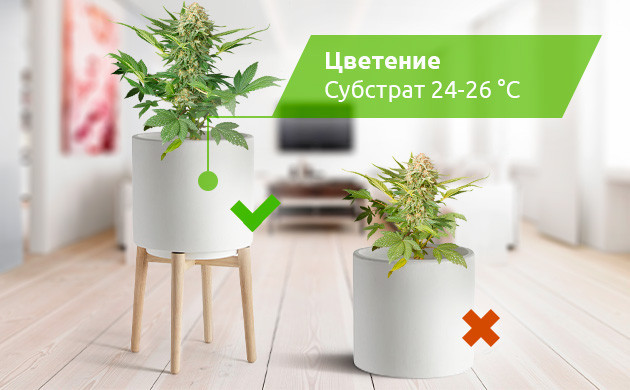 Самым холодным элементом в неотапливаемом помещении обычно является пол. При выращивании конопли в индоре, прежде всего, следует изолировать горшки от него. Неважно, на что вы их поставите. Можно изготовить небольшую подставку из досок или картонных коробок, поднять их на пластиковые ящики или пенопластовые листы, которые используются для теплоизоляции дома. Главное, чтобы этот материал плохо проводил тепло и выступал в роли барьера, ограждающего корни от суточных перепадов температур.