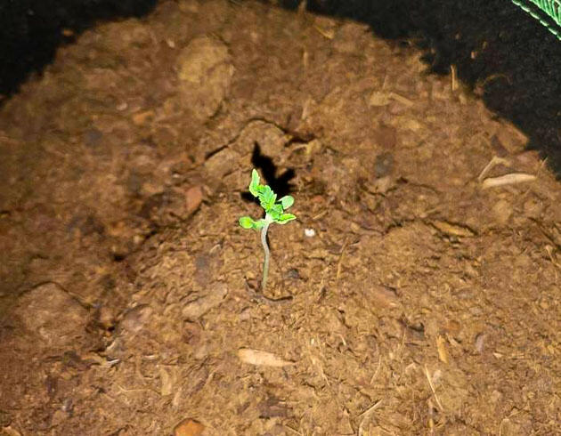Высадку сделал сразу в финальные горшки на 20 литров, чтобы избежать пересадок и не тревожить молодые корни. Уже через пару дней обе показались на свет, но с самого начала между ними наметилась разница. Первая выглядела бодрой и ровной, а вот вторая долго не могла сбросить «каску», за что и получила прозвище Гадкий утенок.