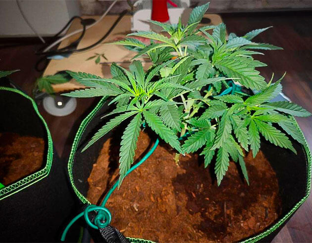 Вместе с тем начал легкую LST-тренировку. Сначала для первой малыхи, а через день и для второй. Растягивал ветки и листья при помощи садовой проволоки. Следовал рекомендациям и просто фиксировал побеги так, чтобы они не затеняли друг друга и занимали свое собственное пространство под лампой. Световой режим все еще держу 18/6. Лампа теперь выдает около 38-44 тысяч люкс на уровне верхушек. По идее, это оптимальный уровень для активной вегетации, и растения чувствуют себя под ним отлично.