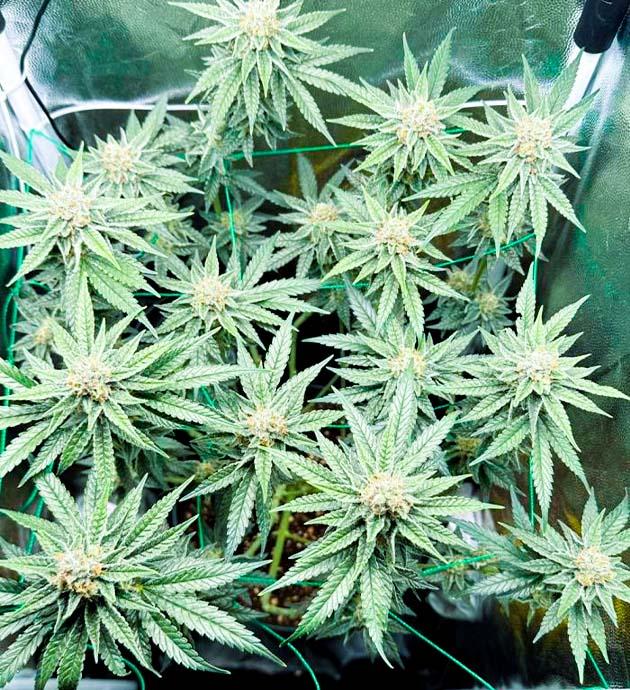 Дополнительно, чтобы зафиксировать ветки в пространстве, натянул на уровне верхушек что-то наподобие сетки ScrOG. Просто подвязывать такие длинные колы к земле уже просто невозможно, ведь куст уже имеет рост около 45 см. А еще он уже цветет и даже приятно попахивает какими-то то ли фруктами, то ли цветами.