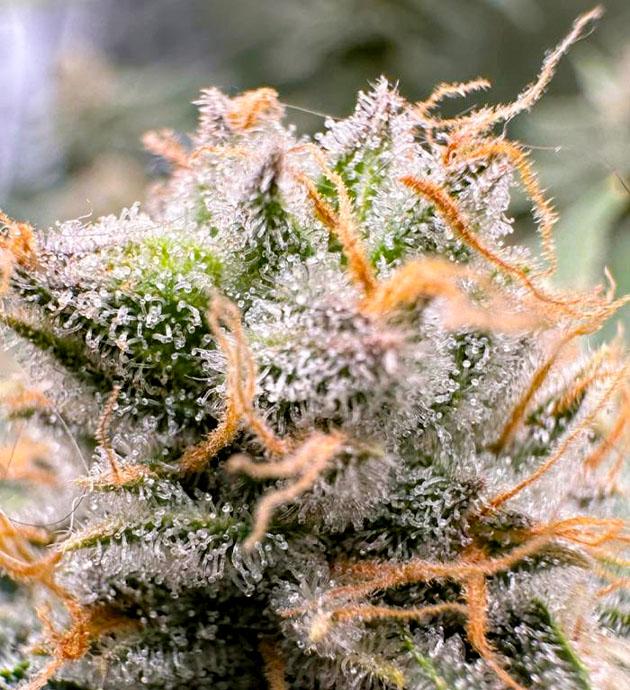 Пятая неделя цветения для Mimosa Evo позади, а преображения все еще в самом разгаре. Листочки все больше переходят в гамму фиолетовых оттенков, на них с каждым днем появляется все больше смолы, запах становится ярче, а волоски на бутонах постепенно темнеют, дополняя картину яркими оранжевыми штрихами. Сами соцветия заметно увеличились в объеме.