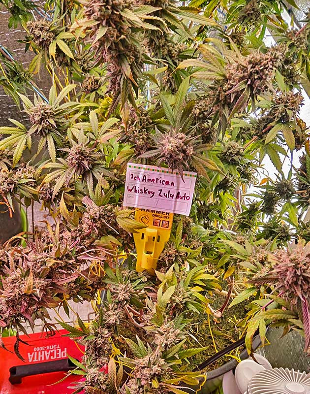 Whiskey Zulu Auto выглядит просто неимоверно красиво! Он невысокий, плотно сложенный, но такой яркий, харизматичный и смолистый, что затмевает своим видом всех соседей. Размер его бутонов тоже впечатляет. Реально отличная генетика!