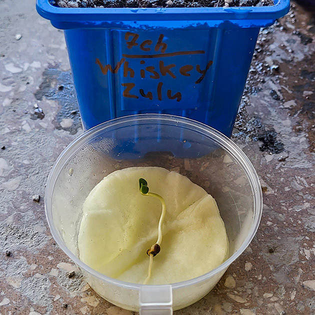 Первый этап при проращивании семян у меня стандартный. Я закидываю семена в воду с добавлением перекиси водорода, чтобы быстрее размочить скорлупу и активировать рост корешка. Семечка Whiskey Zulu Auto напиталась влагой и опустилась на дно за 6 часов. После я приготовил водный раствор Fito Power 0,25 мл/л и переместил орех в новую жидкость. Там он провел еще 12 часов, пока не лопнул и не выпустил наружу корень. Дальше оставлять семечку в воде нежелательно, поэтому я смочил ватные диски в том же растворе Fito Power и положил заветный орешек в теплую влажную среду. На фото вы можете видеть, что через 48 часов меня встретил прекрасный длинный корень, готовый осваивать новые пространства в горшке с грунтом.