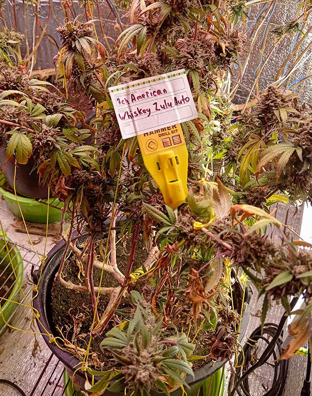 Полные 11 недель жизни за спиной, и эта прекрасная история подошла к своему логическому завершению. После двух недель промывки Whiskey Zulu Auto дошел до пика своей зрелости. Трихомы на 70 % янтарные, а остальные белые. Ветки готовы надломиться под весом твердых шишек, так что самое время собирать этот прелестный пурпурный урожай!