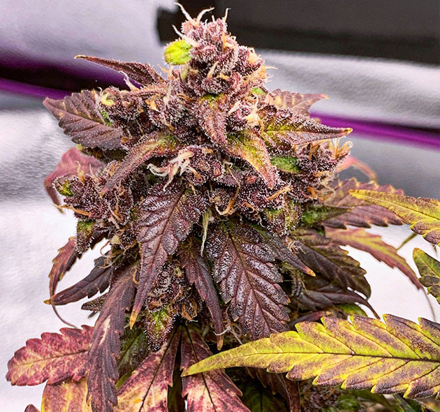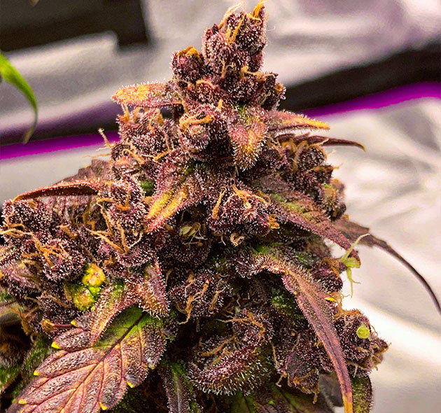 На седьмой неделе начали появляться первые янтарные трихомы на сахарных листках, но на шишках еще встречались даже прозрачные. Запах невероятно сильный, очень приятный ягодный аромат. Очень впечатлен развитием куста в целом и рад, что мне попался фенотип с фирменным черным оттенком, который придает растению особый шарм. Причем цвет именно черный, местами тёмно-фиолетовый.