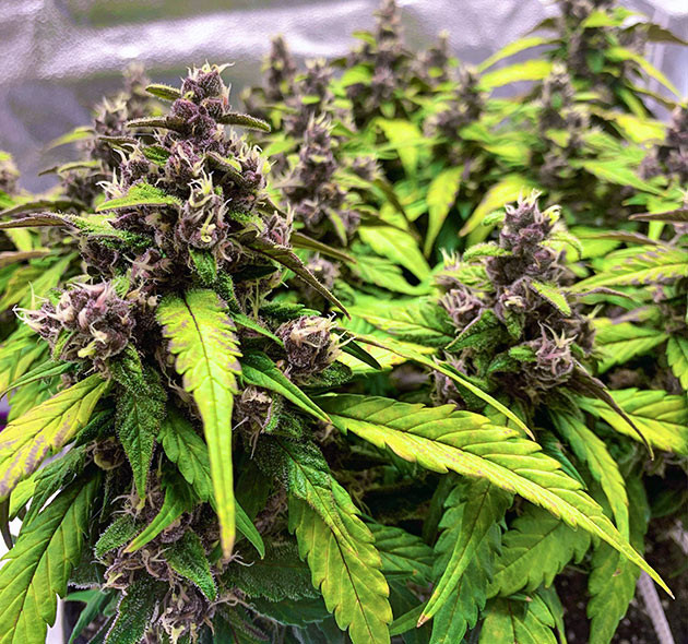 К концу восьмой недели листья стали менять цвет еще стремительней, что меня даже немного напугало. Передо мной был куст с черными шишками и тёмно-красно-фиолетовыми листьями. Цвет насыщенный, чем-то напоминает базилик. Продолжаю давать воду три раза в неделю, но постепенно снижаю количество. На этой неделе лил по 3 литра. Запах стал еще сильнее, хотя казалось, что сильнее уже некуда.