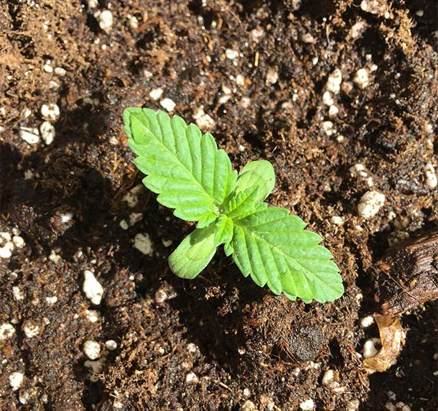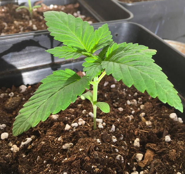 За первые две недели жизни все три куста выросли примерно до 10 см. Первый и второй по структуре и окрасу листьев больше похожи на сативу, а третий имеет более темные и широкие листочки, что намекает на индичную генетику.