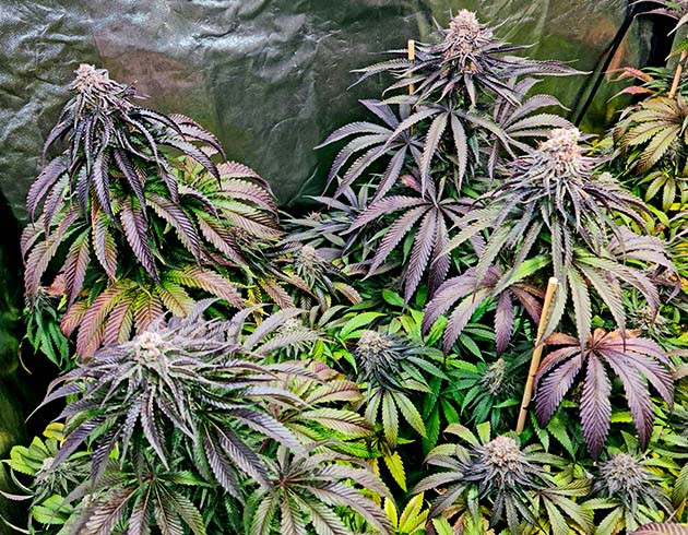 Продолжаю повышать уровень СО2, доведя его до 1200 ppm. За счет этого девочки больше пьют, как следствие, в боксе повышается уровень влажности. Осушитель воздуха работает на максимум, благодаря чему удаётся удерживать влажность на уровне 40-50 %. К этому моменту большие кусты были выше метра, меньшие не доросли до метра. Некоторые растения, вне зависимости от фенотипа, начали приобретать фиолетовый оттенок на макушках и кончиках листвы. В боксе стоит мощный аромат, что совсем неудивительно: сорт пахучий, а тут целых 18 кустов.