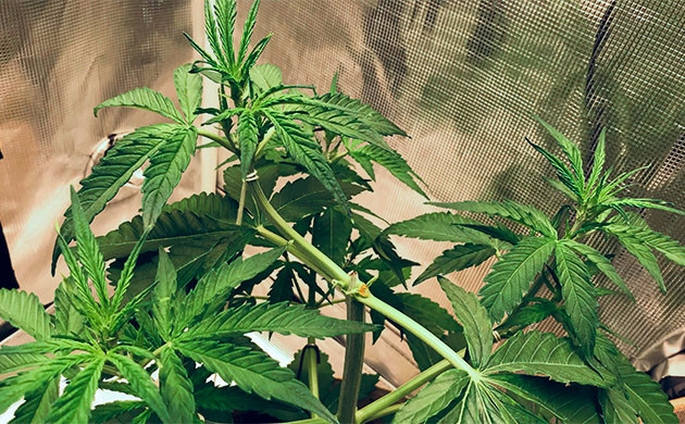 Дальше буду описывать свои манипуляции только с двумя старшими растениями, так как два младших буду растить по абсолютно такой же схеме, аналогично тренируя, поливая и т. д. Итак, к концу пятой недели рост большей девочки был около метра, меньшая была ниже на 30 сантиметров. При этом высокий кустик был более светлым, а низкий темнее. Судя по всему, у меня два разных фенотипа Green Crack Auto. На меньшем кусте решил делать выборочную дефолиацию, так как, в отличие от большого, листва на нем гуще и не все части растения получают достаточно света. Надеюсь, старшие «Грин Крэки» оставят немного света своим младшим сестричкам, и моя задумка не обернется провалом.
