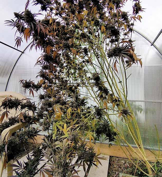 Пьют меньше Кэпы. Сейчас даю пару литров в день. По ночам температура уже 8 - 10 градусов! Теплица теперь выручает, тепло и сухо. Старший Кэп обрастает трихомами по-тихому. На пробу уже можно рубануть ненужные ветки.