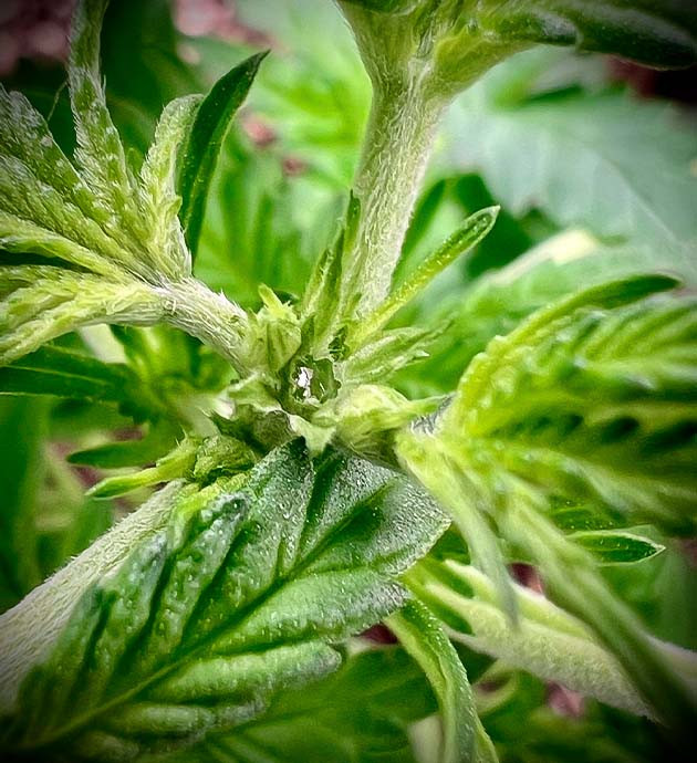 Седьмая неделя, и растишка уверенно тянется, наверстывая упущенное, пока она была «связана» скобами, проволокой и была вынуждена терпеть тренировки. Шишки завязываются, белые волоски группируются в «одуванчики» и будто подмигивают на каждой без исключения макушке. Что касается аромата, то, если постараться различить его в той симфонии, которая царит в гроубоксе, можно почувствовать сладко-травянистый оттенок. Не вишневая кола, конечно, но и не сено с опушки ближайшего леса. Даже в этом лёгком аромате чувствуется «порода». В схеме питания небольшие изменения, начинаем налегать на фосфор: