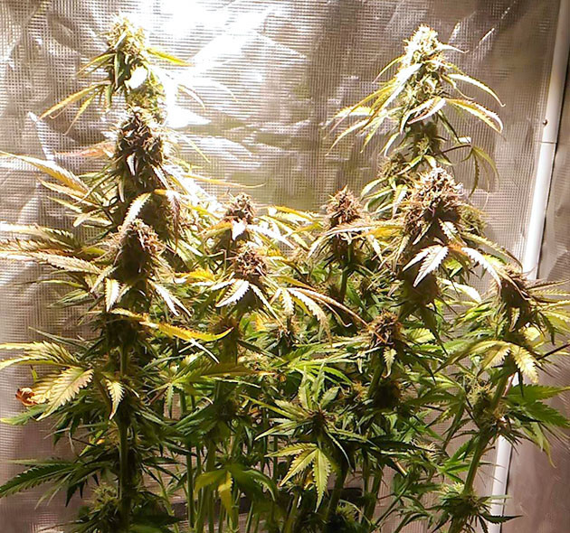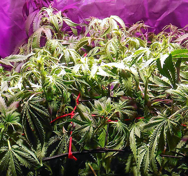 На пятой неделе растения начали цвести. В этой связи я натянул импровизированную сетку ScrOG, чтобы колы развивались лучше и были отделены одна от другой. Моя ошибка – забыл сделать дефолиацию перед скрогом. Высота кустиков по общей макушке – 30-33 сантиметра. Изменил схему питания: