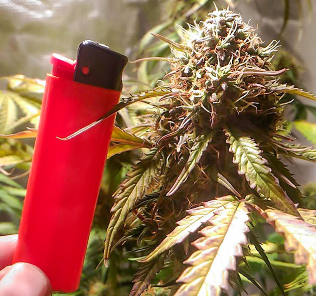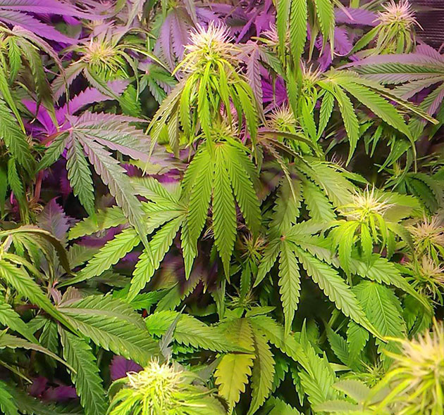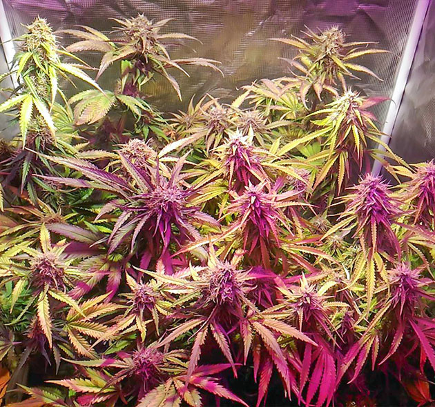 Последние три дня созревания соцветий. Урожай можно было собрать и раньше, но я решил дать бошкам “настояться”, чтобы большинство трихом стали янтарными. Полил один раз по 500 мл отстоянной водой и оставил сохнуть на три дня. Пока растения сохли, начал постепенно удалять листву, чтобы к рубке получить кустики с минимальным количеством листьев. Соцветия получились среднего размера, но их много, и они очень красивые. Получился элегантный фиолетово-красный оттенок без всяких особых манипуляций. В итоге срубил кусты на 59-й день от каски, проманикюрил и отправил сушиться на неделю.