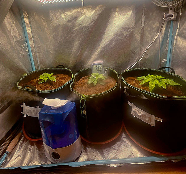 Лампа висит на расстоянии 50 сантиметров от растишек. В палатке 60 % влажности, 23 °C днём и около 20 градусов ночью. Первые три дня ростики стояли под стаканчиками, потом я их убрал.