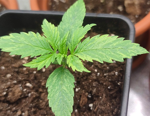 Первая неделя показала, что «ледниковый период» мало чем навредил семечке, по крайней мере, судя по её развитию. Она очень бодро подняла голову и расправила первую пару листьев, а до конца недели уже пробивался этаж с пятипалыми листьями. Поливал саженец один раз, налил 200 мл, чтобы корешки искали влагу и разрастались по горшку. Лампа висит на 60 сантиметров от саженца, включена 18 часов в сутки. Температура в боксе держится в пределах 23-24 °C, особо не опускаясь ночью. Влажность держу на уровне 60 %.