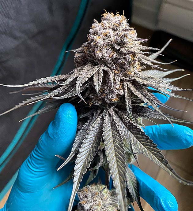 К концу 14-й недели практически все бутоны были уже фиолетовыми. При этом заметна некоторая разница фенотипов. На кусте, расположенном слева, фиолетовый оттенок приобрели в основном сами чашечки, а вот на правом потемнели и все сахарные листья. Соцветия заметно потолстели, а смола, кажется, скоро начнет стекать с шишек от изобилия.