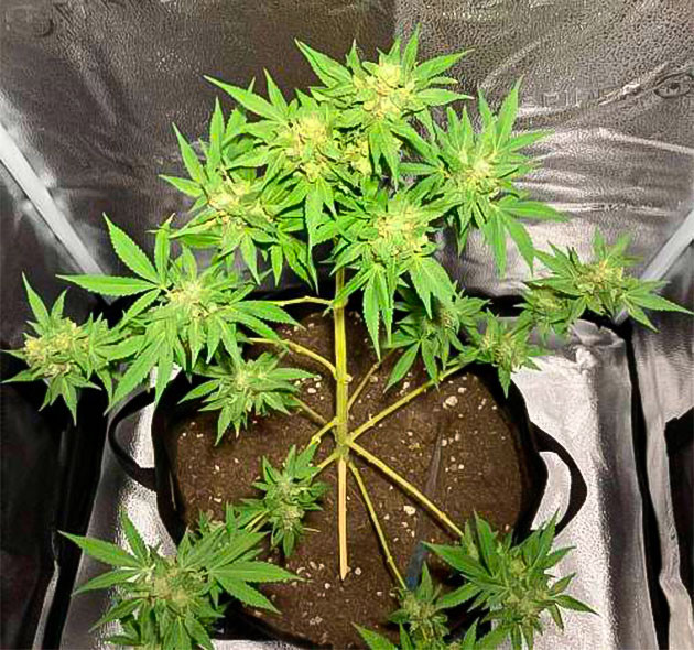 Спустя месяц от каски гибрид вошел в активную фазу развития. Насыщенно-зеленая листва продолжает густеть, не проявляя ни единого признака нехватки удобрений. Да и неоткуда ей взяться, ведь я продолжаю использовать подкормку на основе пропорций, использованных на прошлой неделе. Благодаря сбалансированному и равномерному распределению световых лучей интернодальное расстояние остается коротким. В этот период был осуществлен первый аккуратный подгиб, чтобы обеспечить доступ максимального количества света внутрь кроны. Northern Lights 10 of 10 отлично отреагировал на подобное вмешательство, буквально за пару дней после LST полностью восстановившись от полученного стресса.