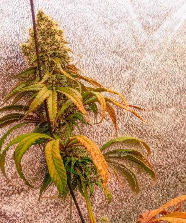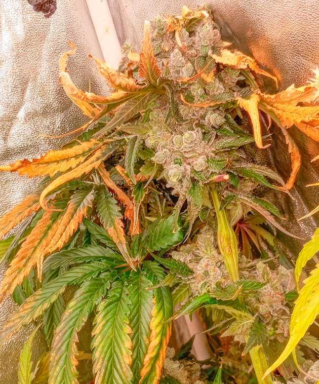 На этой неделе я столкнулся с проблемами после перехода на цветение. Растения с какой-то невероятной скоростью выстрелили до экстремальной высоты, и, кажется, все выходит из-под контроля. Я пытаюсь управлять ситуацией, используя технику суперкроппинга, чтобы контролировать чрезмерное вытягивание, но несколько верхних бутонов все же были сожжены из-за физического контакта со светильниками. Просто не успел заметить этого вовремя.