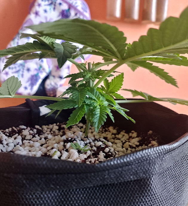 На 6-й день, когда малый уже немного подрос, пересадил его в мешок. Он нормально пережил пересадку и в целом развивается стандартно. За эти пару дней растиха перенесла пару дней жары чуть выше 30 градусов. Сейчас решил немного уменьшить свет, так как хоть бокс и небольшой, но, мне кажется, между этажами слишком маленькое расстояние. Поставил на 50 ватт. Полив водой из осмоса 40 ppm + «Калмаг Plagron pro» 0,6 мл/л + база Sensi Сoco A и В по 1 мл + Bud Candy и B-52 по 1 мл/л. Общий ppm 500, pH 5,8 - 6. Регулируется с помощью pH Perfect. Дренаж: 450 ppm, pH 6,1.