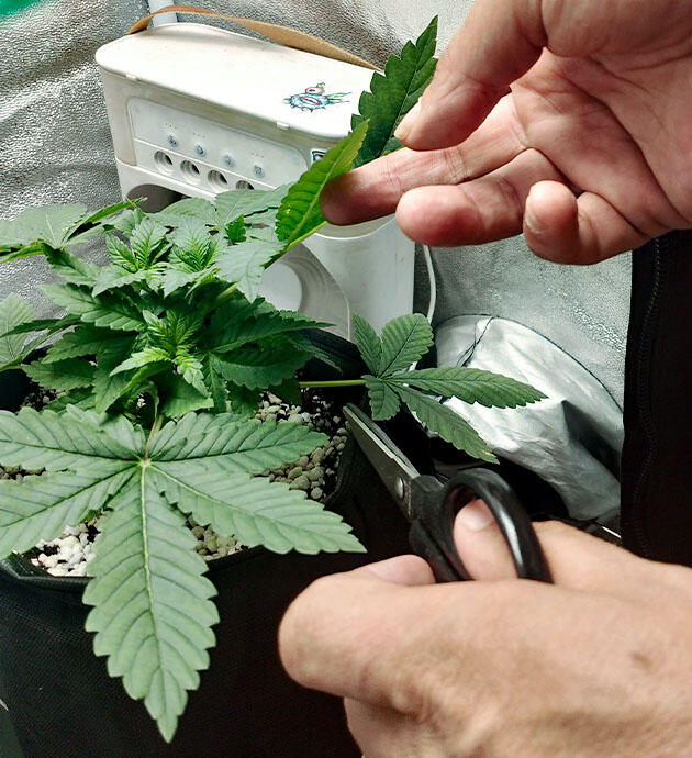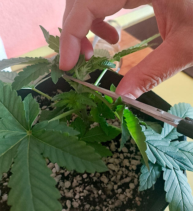 Куст сильно обрастает листвой, то ли генетика такая, то ли от витамина B-52. Сегодня посмотрел и решил, что если он здоров и быстро восстановился, то нужно сделать ему одну хорошую дефолиацию. В принципе, генетика «Семяныча» не подводила, должен пережить нормально. Обработал инструмент и приступил. Убрал практически всю листву сверху сетки, чтобы свет попадал вниз, да и куст лучше продувался. С изначальным объемом листвы сложно было бы избежать плесени в моем боксе 40 на 40. После стрижки убавил свет до 100 ватт. Теперь буду наблюдать, как пойдет дело дальше.