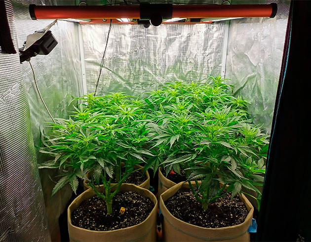К пятой неделе кустики заметно приободрились и стали выглядеть гораздо лучше, если не учитывать изначальную разницу. В этой связи я принял волевое решение и сделал топпинг на двух кустиках, которые выглядели лучше и больше. Также я растянул все четыре растения, аккуратно развел ветви, чтобы лишнего стресса не было. В середине недели сделал лёгкую дефолиацию и был в целом приободрен камбеком, который сделали растишки. Если честно, то я уже решил, что мой второй опыт будет неудачным. Не тут-то было! Начал поливать по схеме «удобрения – чистая вода – удобрения» с перерывом в сутки, лью по 350 мл, что точно немного для горшков по 15 литров. Иногда кажется, что почва даже суховата, но недолив явно лучше перелива. Удобрения те же, в том же количестве, по 3 мл/л Micro, Grow и Bloom.