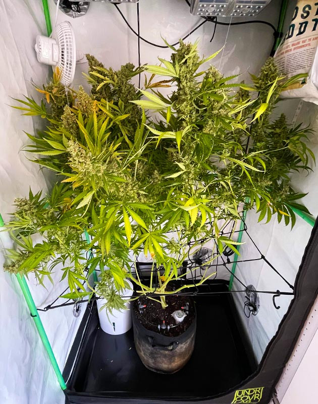 В середине 12-й недели я получил тент побольше, так как тот, в котором стояла вторая девочка, был слишком маленький. Теперь ей предстоял еще один переезд. Сначала перенёс всё оборудование, затем аккуратно снял сетку и переставил горшок с растением в новый тент. Обошлось без происшествий. Обе девочки начали полноценно цвести, набирая массу бутонов.