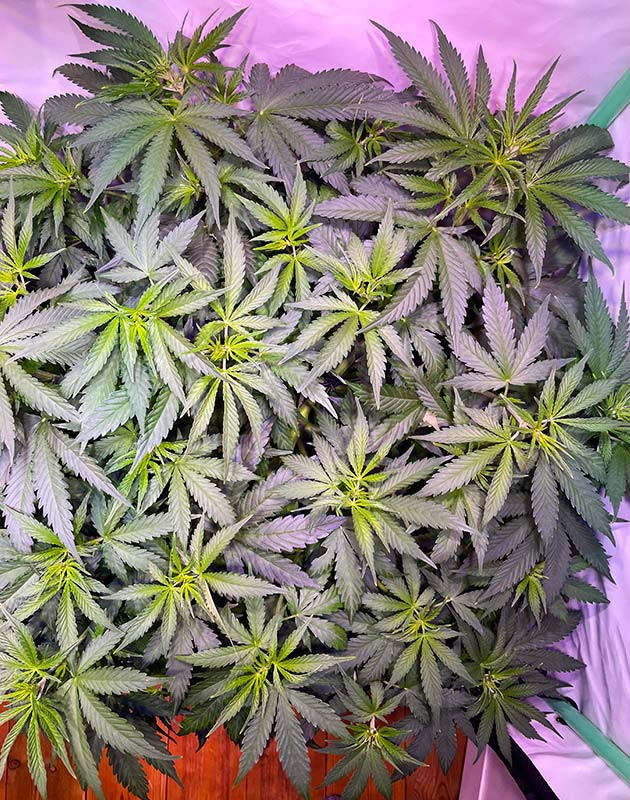 А вот к 16-й неделе соцветия уже налились смолой, некоторая листва начала приобретать фиолетовый оттенок. К моему сожалению, капельная система полива привела к повышению влажности, из-за чего в трёх колах появилась плесень. Пришлось обрезать их и вернуться к ручному поливу.