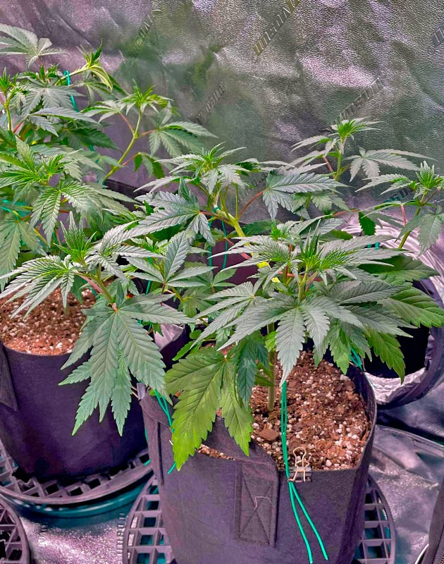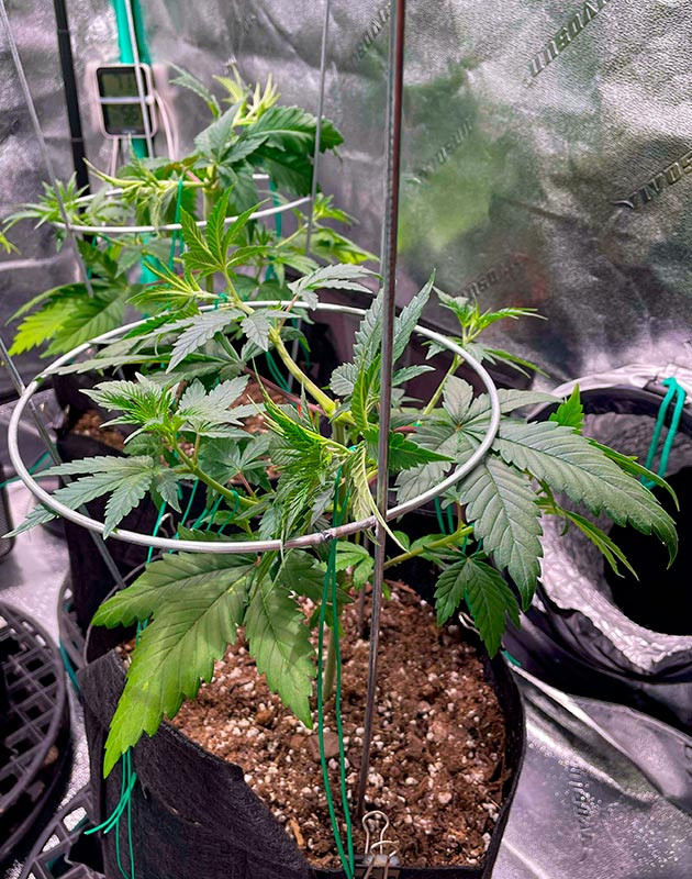 Две недели занимался LST-подгибом и вполне успешно. Кустик вытянулся только до 30 сантиметров, но в скором времени я переведу его на цветение, и уже тогда, надеюсь, он начнет активно расти. Пока это несильно большая растишка с крепким центральным стеблем и большим количеством веерных листьев, которые потом нужно будет обрезать.