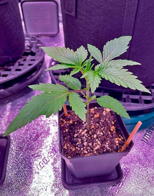 Семечко благополучно прижилось в небольшом горшке на 0,5 литра и за неделю превратилось в росток высотой в 5 сантиметров. С пересадкой пока не спешу, но она, несомненно, будет. Температура воздуха днем составляет 27 °С, а в ночное время суток – 20 °С. Световой режим установлен 18/6, уровень влажности 56 %. Из удобрений я пока использую лишь Cal-Mag Plus в количестве 0,6 мл/л.