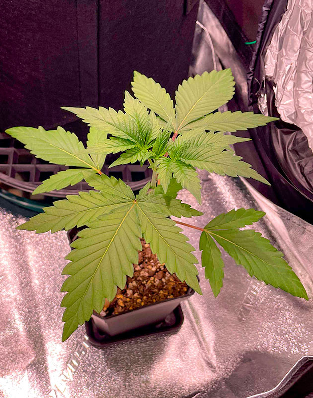 За две недели росток заметно вытянулся и сформировал несколько веерных листьев. На 18-й день я провел топпинг, и пока никаких признаков стресса не наблюдается. На второй неделе я уменьшил количество Cal-Mag Plus до 0,3 мл/л, а на третьей перестал давать его.
