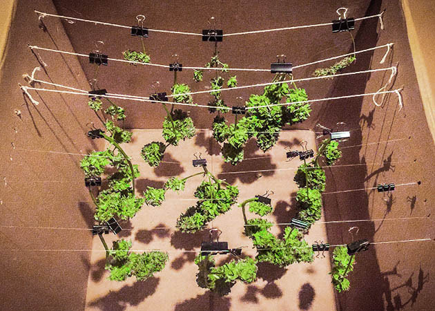 После формирования 4-го узла я начал гнуть кустик. Использую для этого обычные джутовые веревки и биндеры, прикрепленные к краям горшка. С ними легко работать и удобно корректировать силу натяжения. Сам кустик гибкий, но я все равно работаю аккуратно, так как из-за спешки уже сломал два раза центральный стебель у других растений и теперь стараюсь предварительно размягчать каждую из кол, которую планирую изгибать.