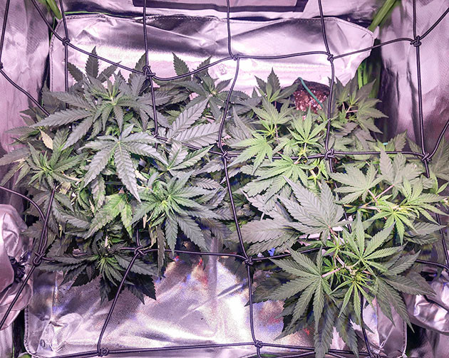 За эти две недели я успел прибегнуть к LST-подгибу, топпингу, а также ScrOG. В целом растишка перенесла тренировки просто замечательно, не выказав никаких признаков стресса. К концу пятой недели высота куста уже достигла отметки в 32 сантиметра. С моей стороны было лишь уменьшение расстояния между лампой и верхушкой растения до 45 сантиметров. На фото вы можете увидеть другой кустик (слева), который я выращиваю параллельно с Euforia X (справа) и о котором расскажу в другом месте.