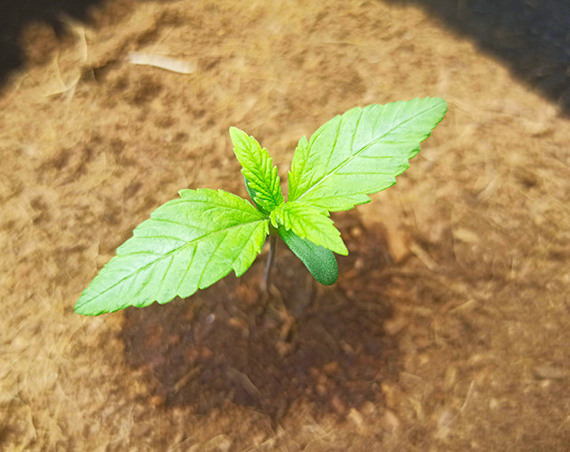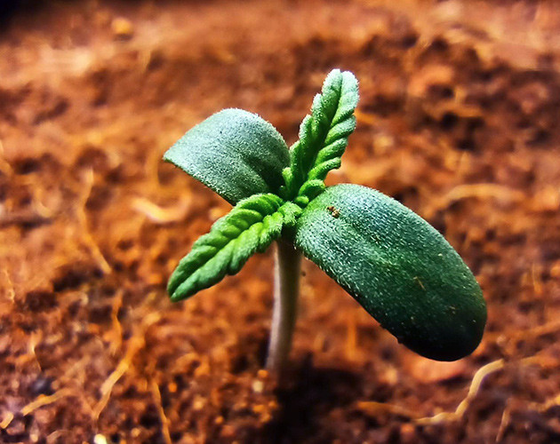 Для начала замочил семечку в стакане с водой, а потом просто забросил ее в небольшой стаканчик с кокосовым грунтом, в который заблаговременно добавил раствор Voodoo Juice и Piranha от Advanced Nutrients для стимуляции корнеобразования и роста. Пришлось немного подождать, но через четыре дня над поверхностью субстрата виднелся небольшой росточек с каской, а еще через день, когда каска была сброшена, я пересадил его в окончательный тканевый горшок на 11 литров.