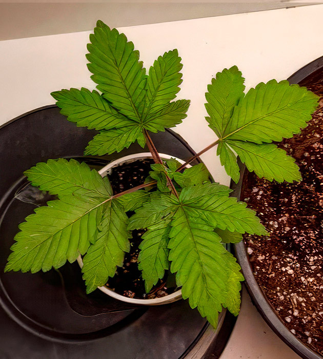 Первые несколько недель жизни саженец провел в общем помещении с другой рассадой. Там он успешно проклюнулся, скинул каску и стал один за другим показывать мне свои прекрасные зеленые листочки. За три недели он окреп, хорошо вытянулся и успел вырастить целых 6 этажей листьев. Я обрезал все выше 4-го узла и стал ждать восстановления девочки для того, чтобы пересадить кустик в следующий горшок.