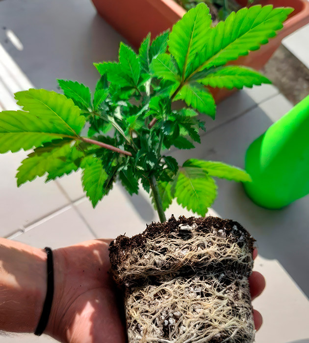 На 4-й неделе я пересадил его в 5-литровый горшок и через сутки полил растение первым питательным раствором. Корневая система действительно была похожа на плотный белый клубок. После пересадки дела пошли значительно лучше.