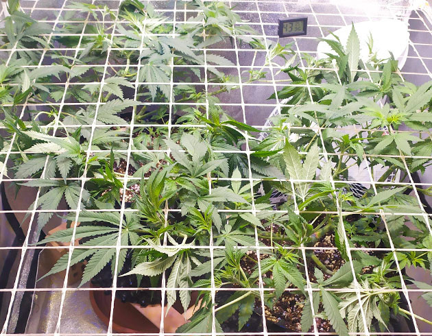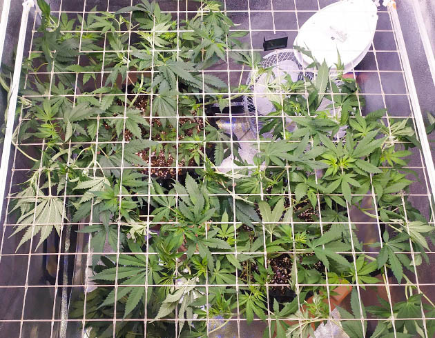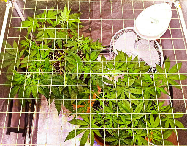 На шестой неделе произошло много событий. Во-первых, я сломал одну из основных ветвей. Делал всё как обычно, перед тем как гнуть, не поливал кусты двое суток, но веточка всё-таки сломалась. Смазал место надлома мёдом и подпер в нужном направлении. Увы, на этом еще не все. Веточка постепенно восстанавливалась. Я установил сетку скрог, в то время, когда ставил под нее кусты, снова надломил поврежденную ветку. Однако растение справилось, и ветка постепенно пришла в норму. В результате комплекса манипуляций (топпинг, LST, дефолиация и обрезка нижних ярусов) у меня получился полноценный мейн-лининг. После того как поставил кусты под сетку, перевел свет на режим 12/12.