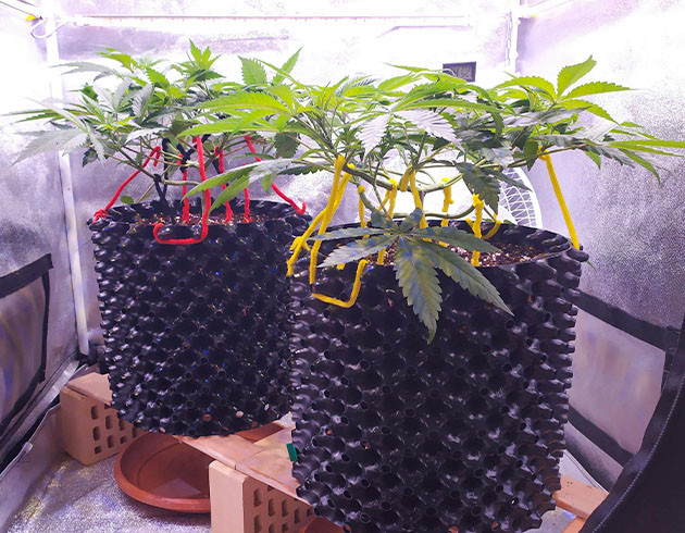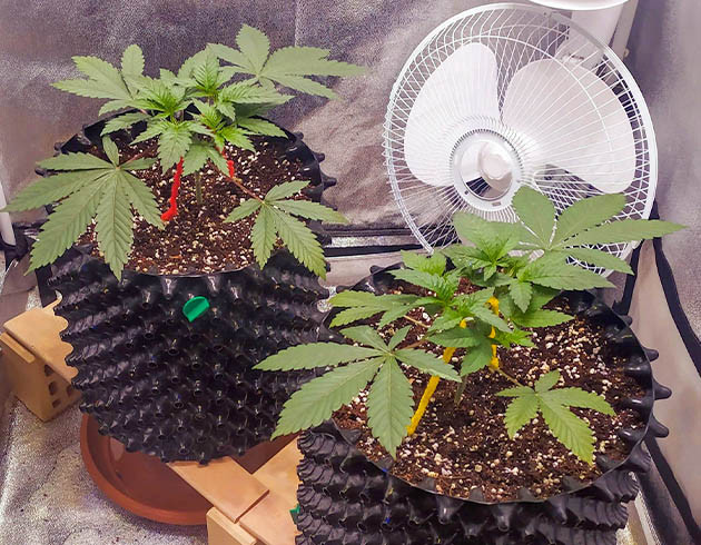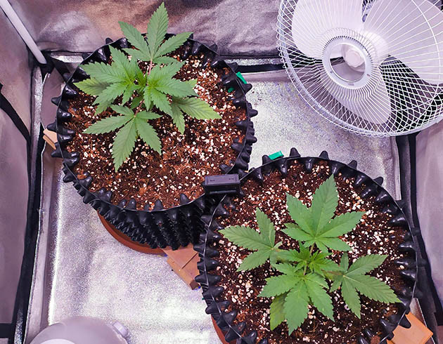 Итак, отсчет грова пошёл с того момента, как проклюнулись ростки. Они скинули каску практически одновременно. Первое время будут развиваться в небольших горшках по 0,5 л, после чего переедут в смартпоты. Для освещения использую борд на 240 Вт. Он висит на расстоянии 70 сантиметров от саженцев. В боксе стоит увлажнитель, бака хватает на сутки. Таким образом, удаётся держать влажность на уровне 50 %. Температура днем 25 °C, ночью опускается до 18 °C. Через пару дней в таких условиях растишки немного вытянулись. Поливал через день с небольшим количеством Power Roots.