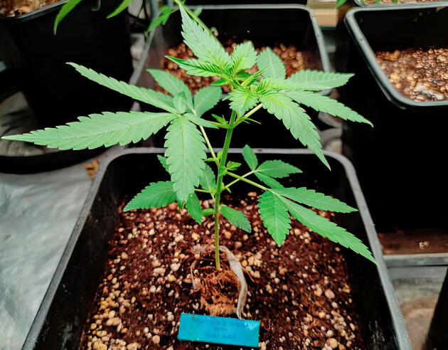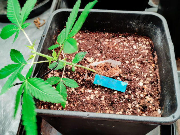 Росток вытянулся и уже успел переехать в свой конечный горшок. Посадка у меня густая, места немного, так что использую для автиков небольшие горшки на 5 литров. Сначала заполнил кокосово-перлитовой смесью не полностью, так как стебель был тонкий и длинный. Если что, то будет возможность подсыпать субстрата сверху и зафиксировать растение пожестче.