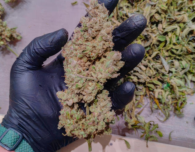 Шишки вышли невероятно крупные, плотно набитые и обильно покрытые трихомами. Достаточно слегка прикоснуться к ним, чтобы на руках остался плотный липкий слой смолы. Аромат поражает своей сложностью. В нем есть и резкие сканковые ноты, и сладость с явным фруктовым акцентом, и легкая терпкость, которая добавляет глубины.