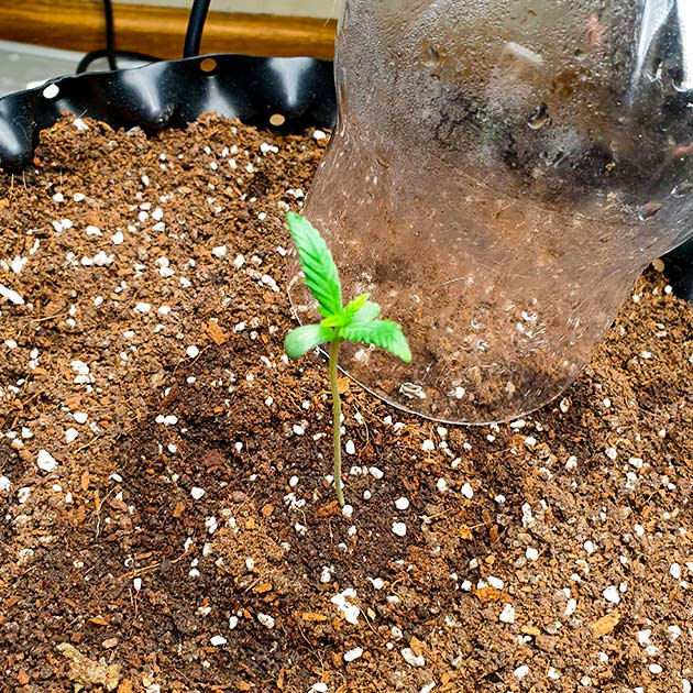 Понял, что растению сложновато находиться при влажности в 45 %, так что обрезал верхушку двухлитровой бутылки от колы и установил ее над саженцем в качестве портативного парника. Вместе с этим установил свет на 25 000 люкс. Через два дня листья поднялись вверх, как будто до этого она испытывала некий стресс. Я снова приглушил свет до 20 %, и все быстро вернулось в норму.
