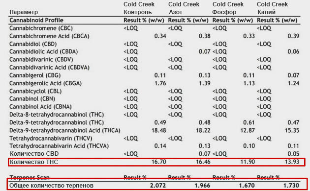 Нарушения баланса питания сказались и на содержании активных веществ конопли: ТГК, КБД и прочих каннабиноидов и терпенов. Разница не настолько впечатляющая, как в отношении урожайности, но все же присутствует.