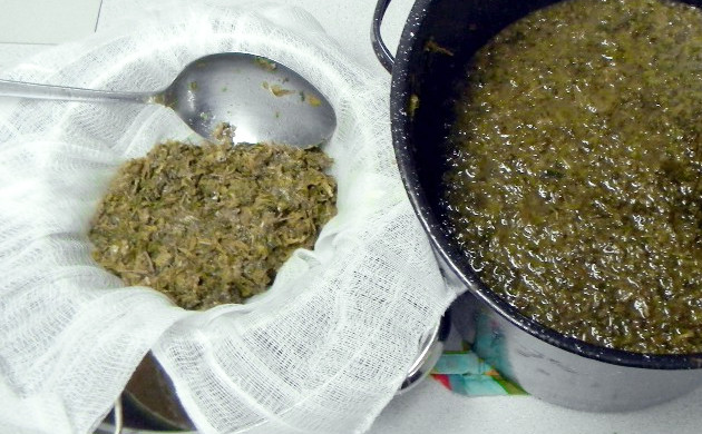 - Полученную "заварку" процеживаем через два слоя марли или пищевого фильтровального материала. Отжимаем, остужаем, ставим в холодильник.