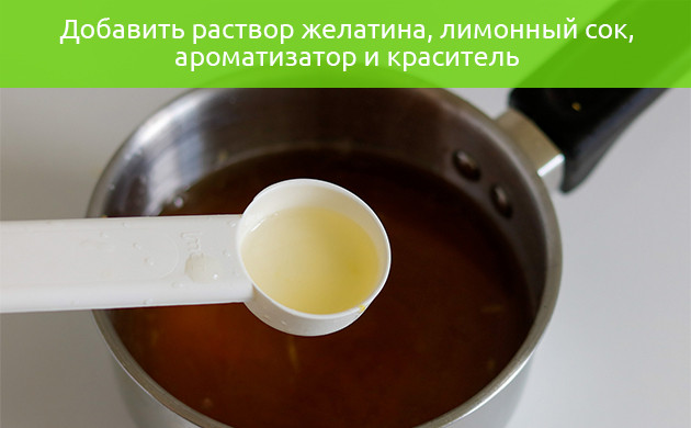 5. Туда же вливаются раствор желатина, лимонный сок, ароматизатор и краситель, если вы решили их добавить.