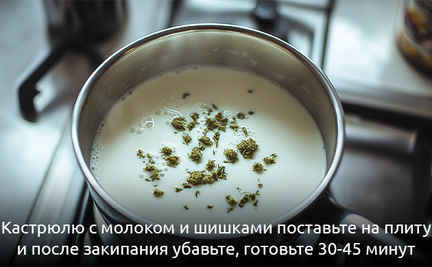 - Влейте в кастрюлю нужное количество молока и добавьте туда предварительно активированную марихуану. Сначала она будет плавать на поверхности жидкости, но, по мере нагревания массы, кусочки шишек станут напитываться влагой и опускаться на дно.