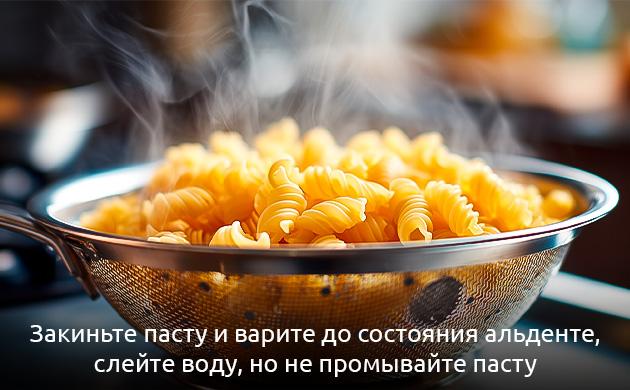 • Не переваривайте макароны. Макароны альденте сохраняют текстуру и не превращаются в кашу после смешивания с соусом. Они ещё немного дойдут в горячем соусе и останутся плотными и аппетитными на вкус.