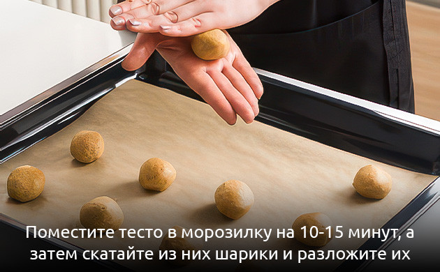 • Разложите шарики из теста на противне, застеленном пергаментной бумагой, а сверху придавите их дном стакана или ладонью.