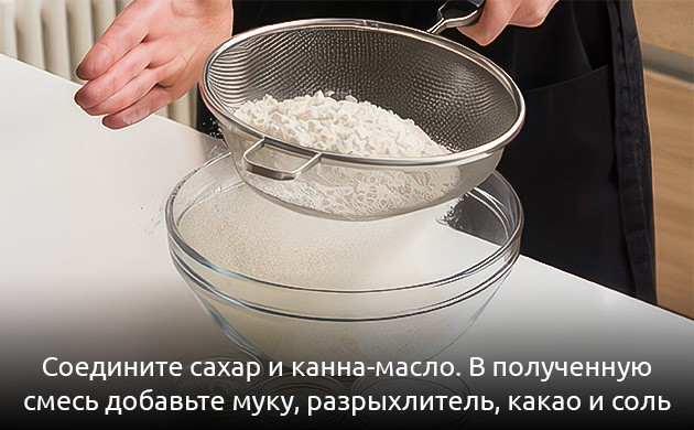 • В полученную смесь добавьте муку, разрыхлитель, какао и соль. Все эти компоненты нужно пропустить через сито, чтобы разбить мелкие комочки и насытить смесь воздухом.