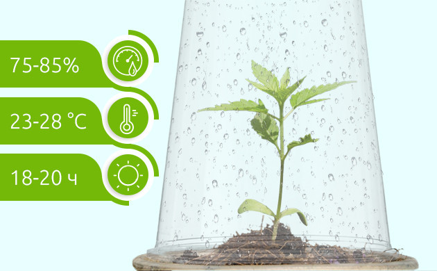 Идеальными считаются парниковые условия, при которых влажность достигает 75-85 %, а движение воздуха сводится к минимуму. Для этого можно воспользоваться специальными пропагаторами или мини-парниками. Если вы высадили росток в горшок, то его можно накрыть пленкой с отверстиями для вентиляции или поместить над побегом пластиковый стаканчик с аналогичными вентиляционными отверстиями.